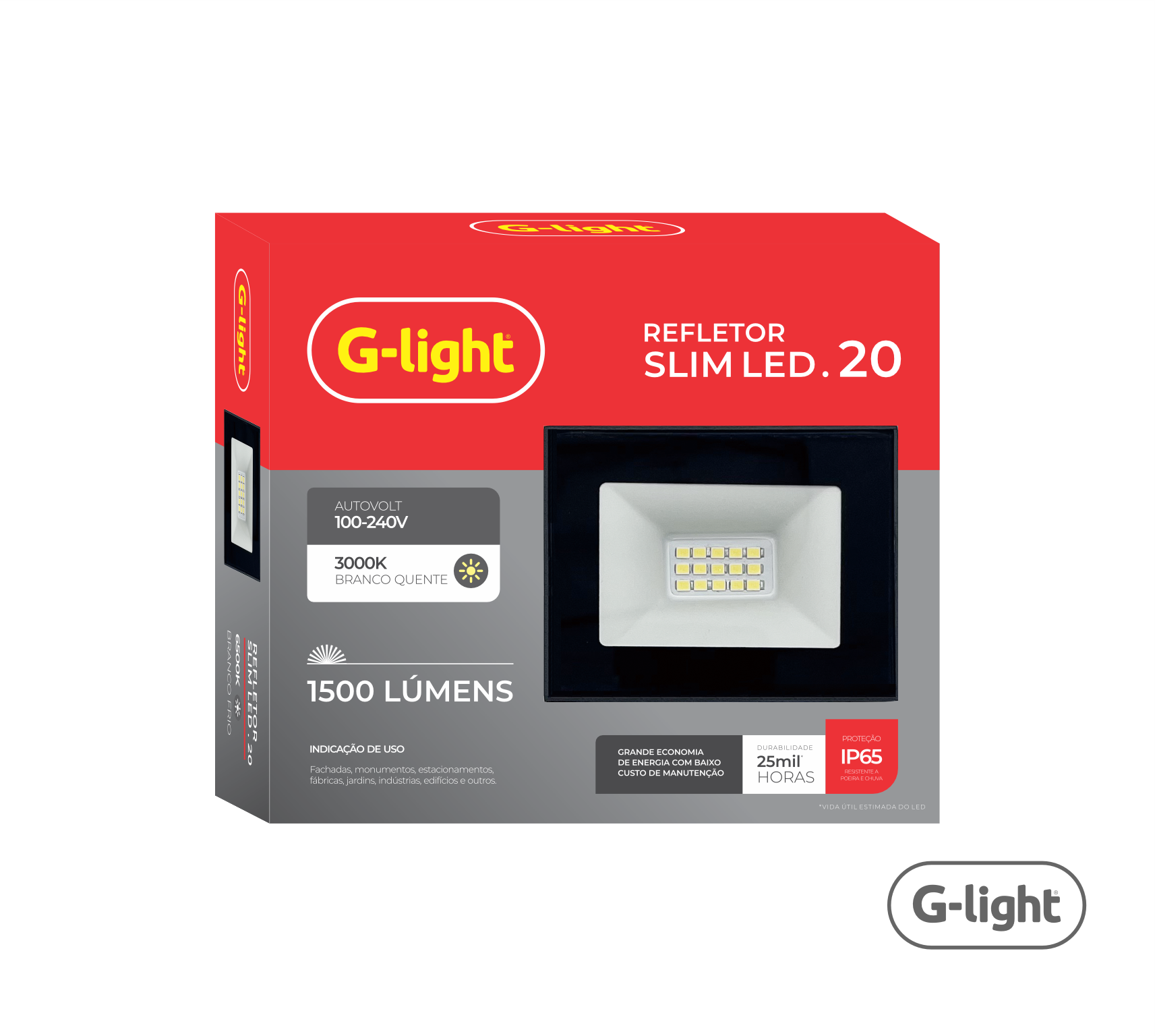 75lm/W 0,5 Alça 1500lm 70 65 83,5x24x65mm 20W 3000K 110-240 (AUTOVOLT) 25.000 110